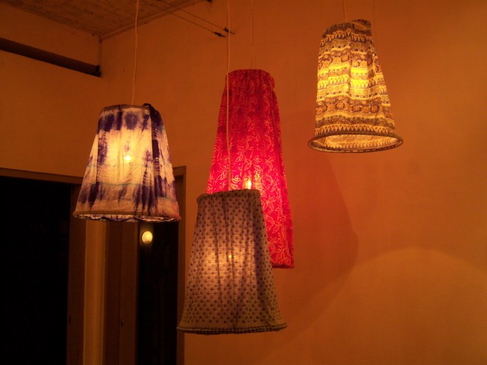 Masih sekilas pandang, Anda akan menemukan ruang pamer Kedai Kebun Forum dipenuhi lampion-lampion karya SIMPONI. Lampion-lampion yang dibuat dari koleksi rok mereka sendiri ini memenuhi, sekaligus menghias, ruangan. Saya tidak melihatnya sebagai dekorasi semata. Lampion-lampion itu, apabila Anda mau meniliknya lebih lanjut, justru menyatakan posisi SIMPONI dalam kehidupan masing-masing anggotanya. SIMPONI, menurut saya, berusaha menyatakan bahwa mereka, secara kelompok, saling memenuhi dan saling menghiasi kehidupan masing-masing.