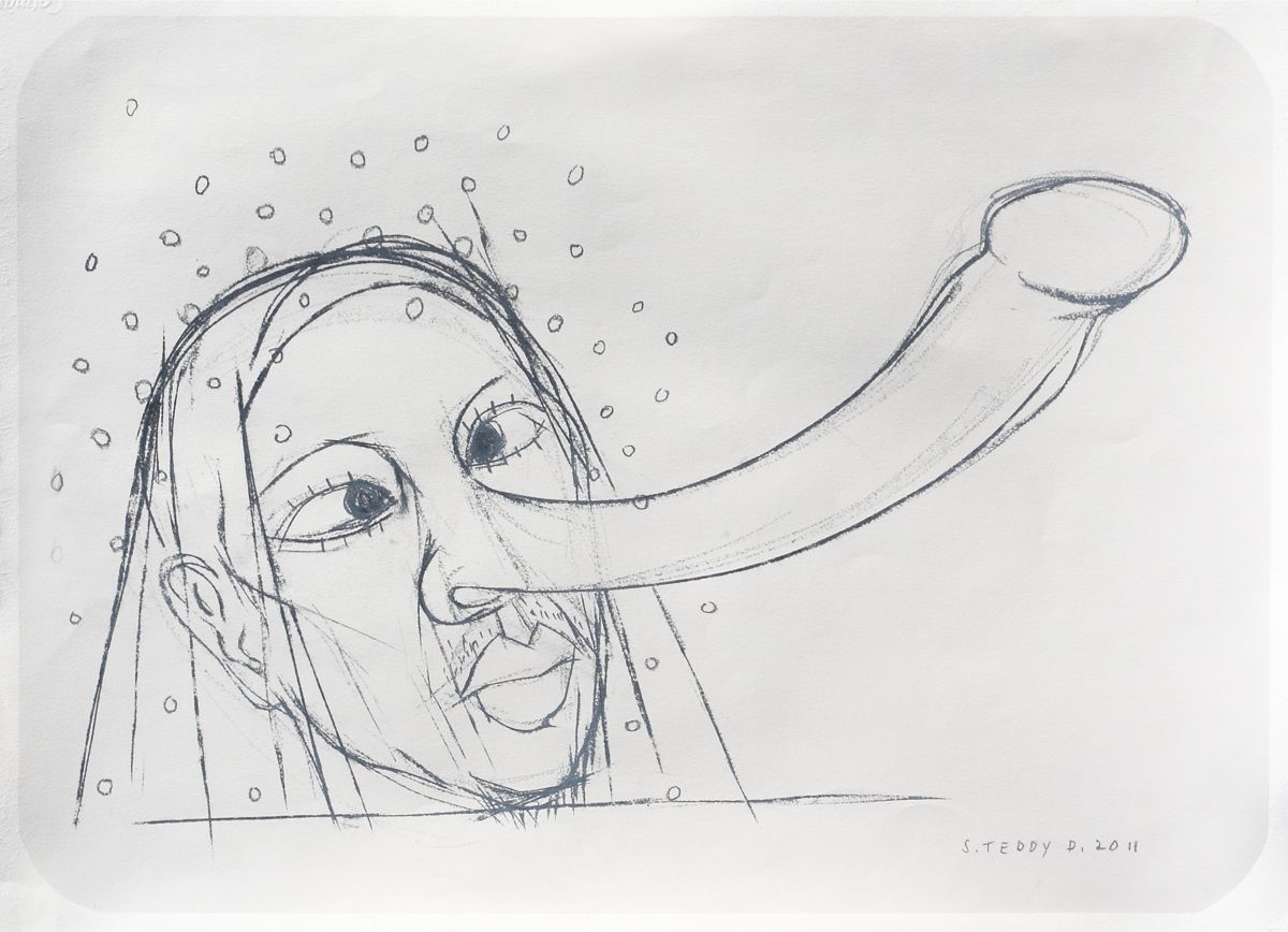In an era when artists tend to “take cover” in such arguments as “this is my experience” or “this is my diary”, Teddy is one of the few artists (at least in Indonesia) who no longer need to use such arguments. Each work by an artist will in any case result from that artist’s idea, and is therefore based on his or her experience. The father of cognitive psychology, Ulric Neisser, offers an interesting statement about human memory. Neisser explained how the process of remembering in human’s brain is the same with the process of problem solving.(6) To remember is not actually to explore in all accuracy the events as recorded in our mind, but rather to reconstruct the recollected event, mixed with our experiences and the wish to see that what is being remembered is in accordance with our current condition. When we apply Neisser’s explanation in the case of Teddy’s recollection about the image of phallus, we can say that Teddy seems to want to experience a trauma. He wants to use trauma as the reason, his reason. It is a straight-forward process, but at the same time is also complex. The human mind (and consciousness) is a complicated thing. Teddy’s works, more often than not, succeed in appearing simple but with extraordinary visual strength and message, presented in “too simple” forms that might seem messy, rough, or wild.