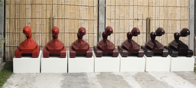 The phallus images (as well as his noisy motorbike) that Teddy presents today in this exhibition intrigue me and make me want to write this essay by using the almost-ancient Freudian theory of Id, Ego, and Super-ego.(5) To cut the story short, Super-ego according to Freud is the moral element of a human being, growing and developing in line with the agreements (and constructions) of ethics around him, arising at the end of that which Freud called the “Phallic Stage” (before adolescent). Super-ego is human consciousness that enables one to determine whether something is right or wrong. I position Super-ego as the representative of humanity (which according to Teddy we humans have outwitted through wars). To Teddy, the war is masculine, phallus is masculine, war is wrong, and masculinity disturbs him. It is classic and clichéd—just as Teddy’s stance toward his works. Just as how Freud had cursed the phallus, the symbol of human potency, as ancient libido.