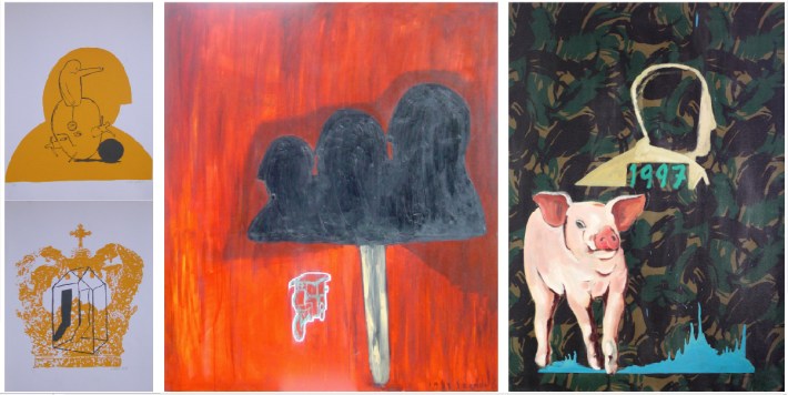 - 1997 (1998, oil on miltary fabric/cloth): “People had been really afraid to use such [militaristic] camouflage material to joke around, much less to make insults. But, well, this was in 1997. People were demonstrating, protesting. Apart from being involved in the demonstrations, I was doing it in my works, too.” (In 1998, Indonesia was undergoing a reform period. The government with its “guided democracy” style, led by a “smiling dictator” who had ruled the country for 32 years, went down after a tide of demonstrations and protests initiated by university students all over the country.)